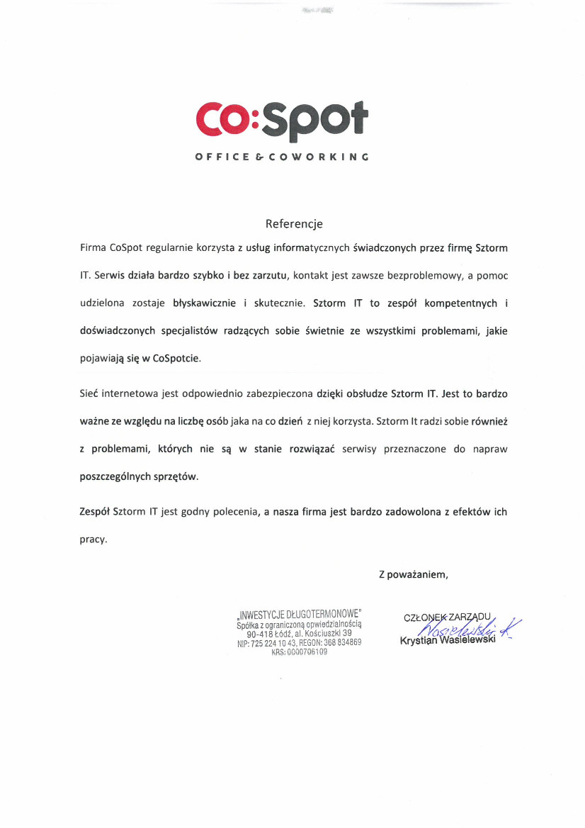 W pakiecie Sztorm Max oferujemy testową wizytę informatyka w firmie klienta – pozwala to sprawdzić jakość obsługi i kompetencje naszego zespołu przed rozpoczęciem stałej współpracy. Zawsze oferujemy bezpłatną wycenę i audyt wstępny infrastruktury, aby precyzyjnie dopasować pakiet do potrzeb.